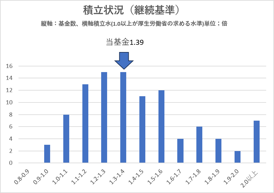- 基金では、確定給付企業年金法の定めにより、毎事業年度末の決算日時点において、年金資産の積立水準が一定のレベルを満たしているかを見るために、2種類の基準(継続基準と非継続基準)による財政検証を行うことが義務付けられています。